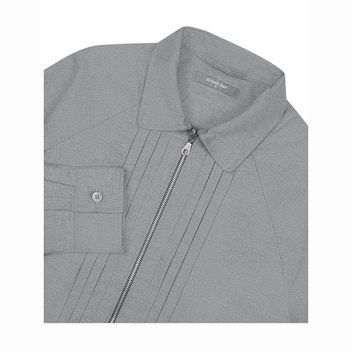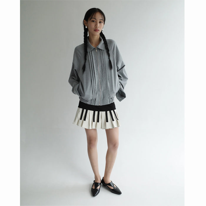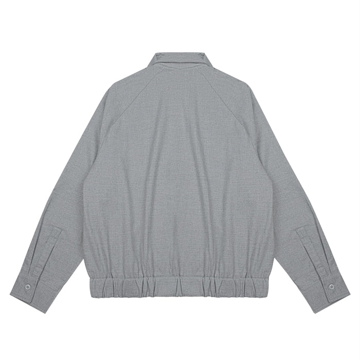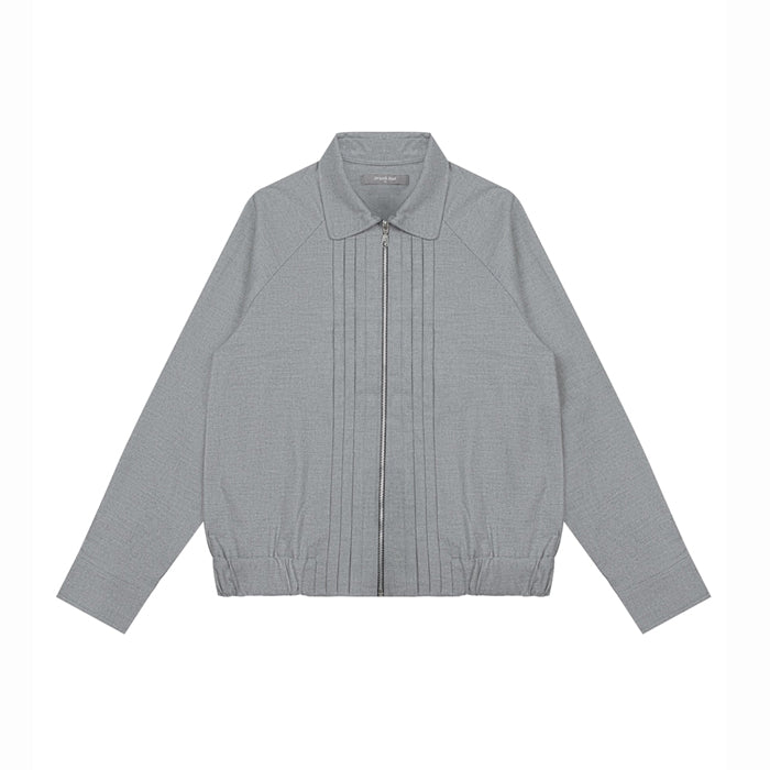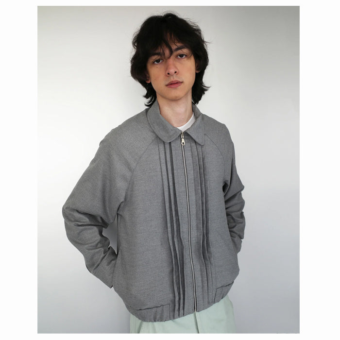 Grey unisex jacket in polyester blend with raglan sleeves and front pleated details. Jacket comes with elasticated waist on the bottom hem and side pockets