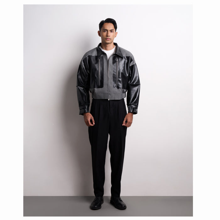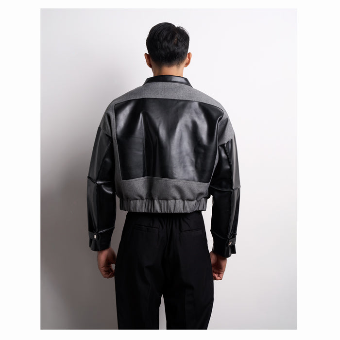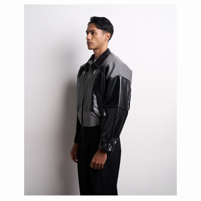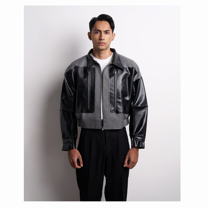 GREY BLACK ZIPPER LEATHER OVERSIZED JACKET
